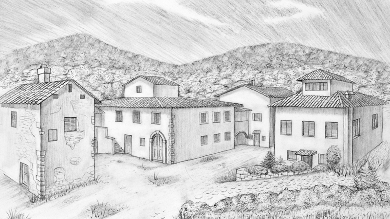 The following illustration drawn by Brian Bromborsky shows the farm complex that housed five families, two of which helped two American airmen to evade the enemy during the summer of 1944.